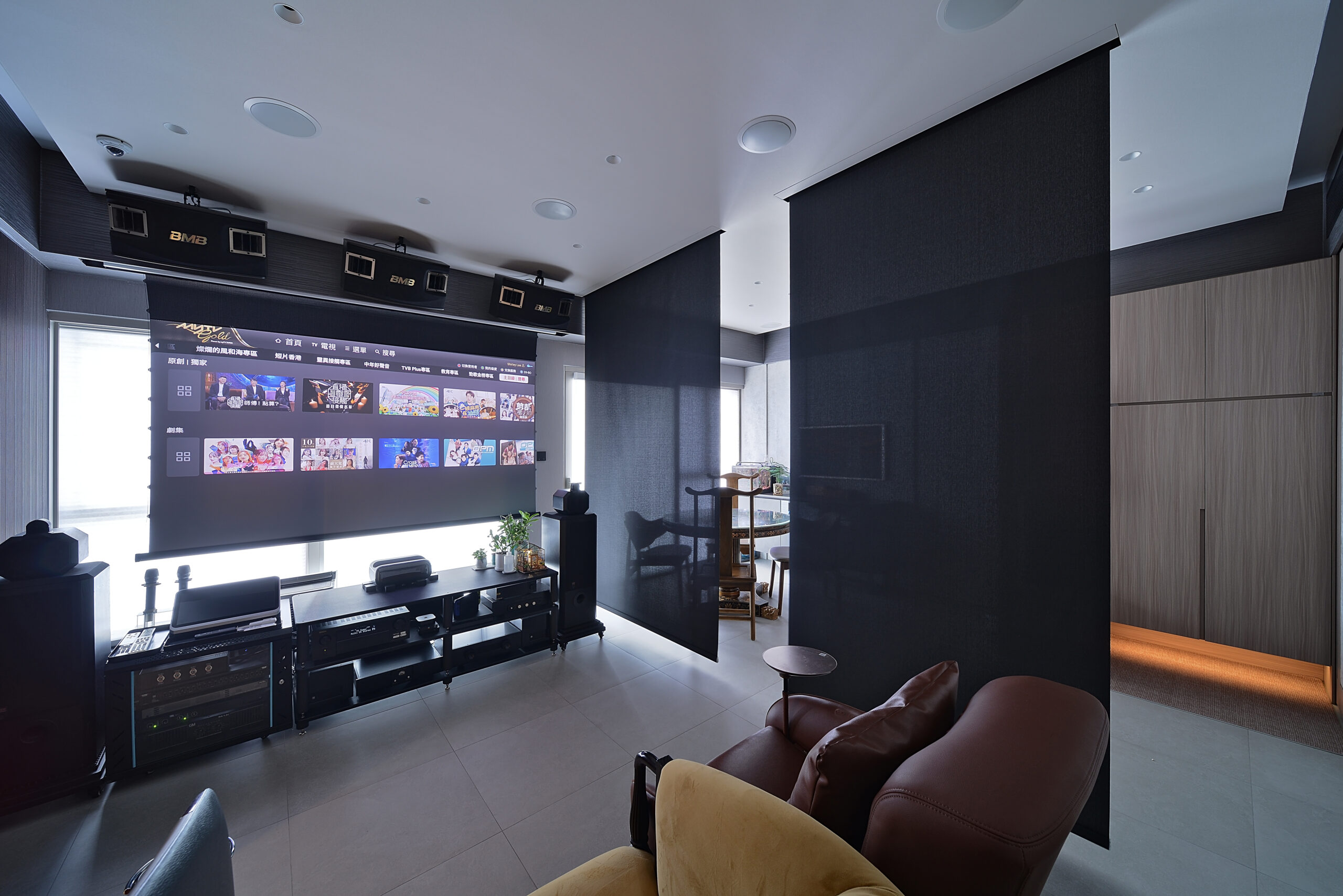 戶主對家庭影院有要求,兩區之間安裝了暗格調黑色系捲簾,提供理想的光線調節。打造出一個專屬的私人影院,大大地提升了空間的私密性,完美滿足影視沈浸式地觀影體驗。