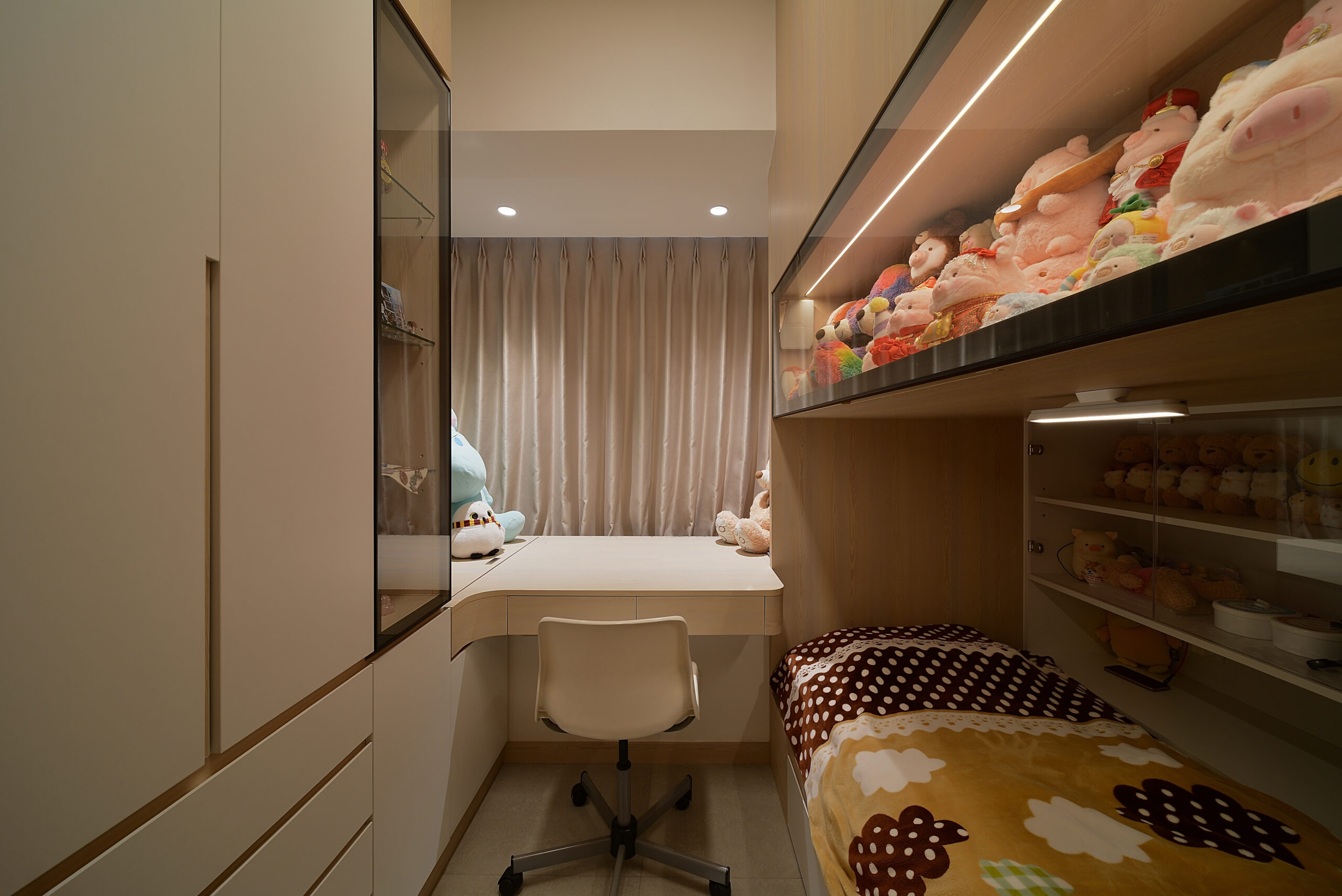 女兒房間甜蜜溫馨,特別設計了展示心愛毛公仔的空間,書枱、高身衣櫃等配備齊全,甫入房內,別有一幅獨立小天地。