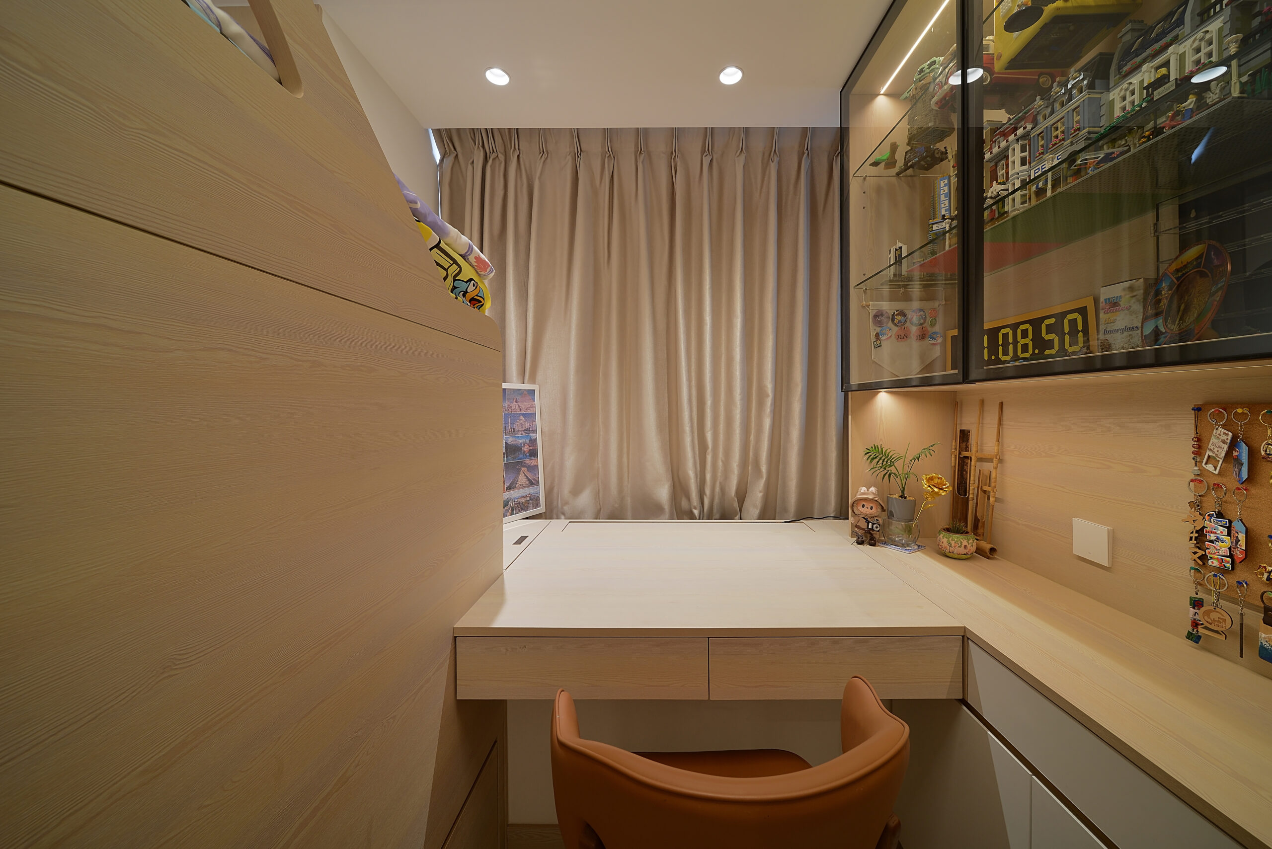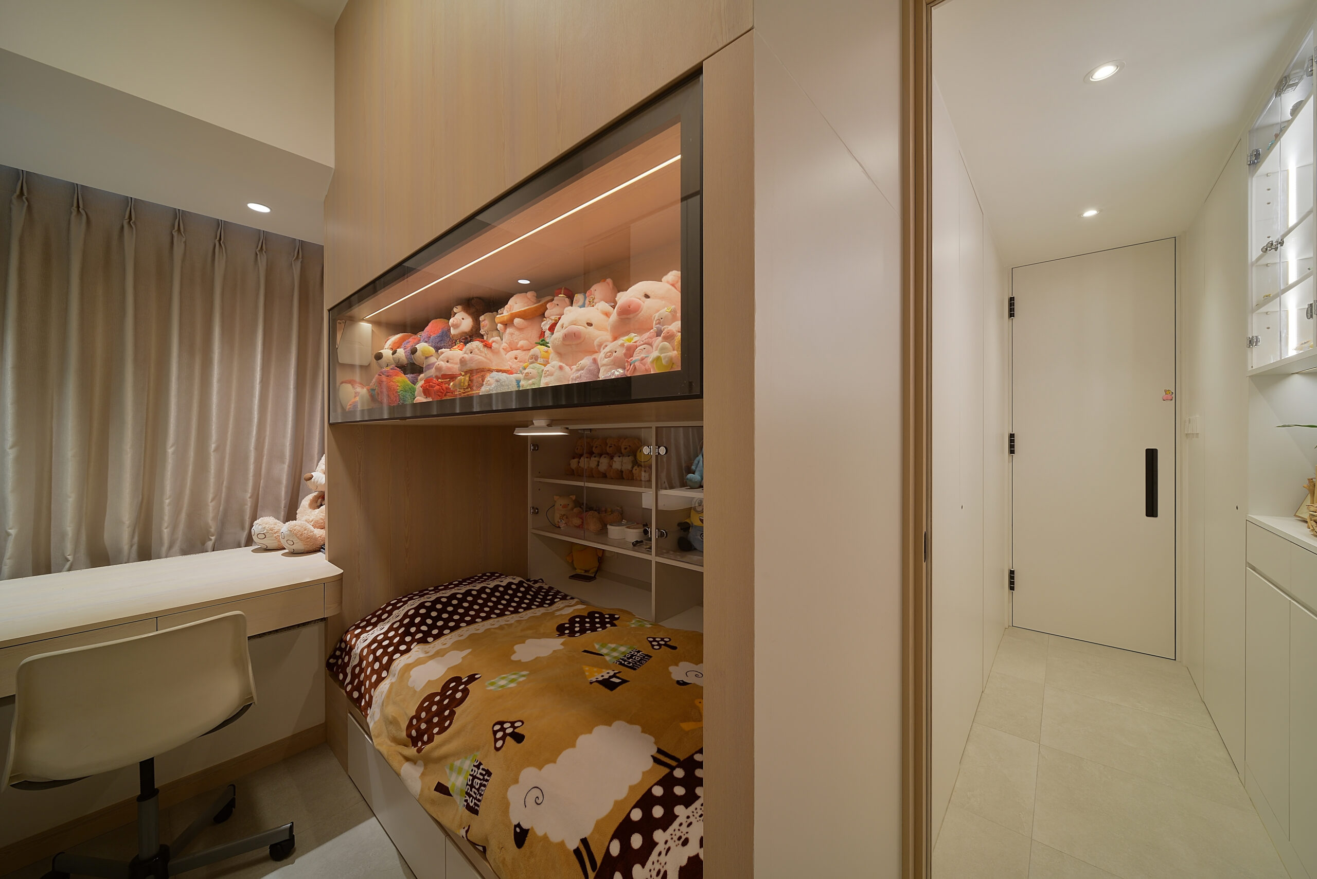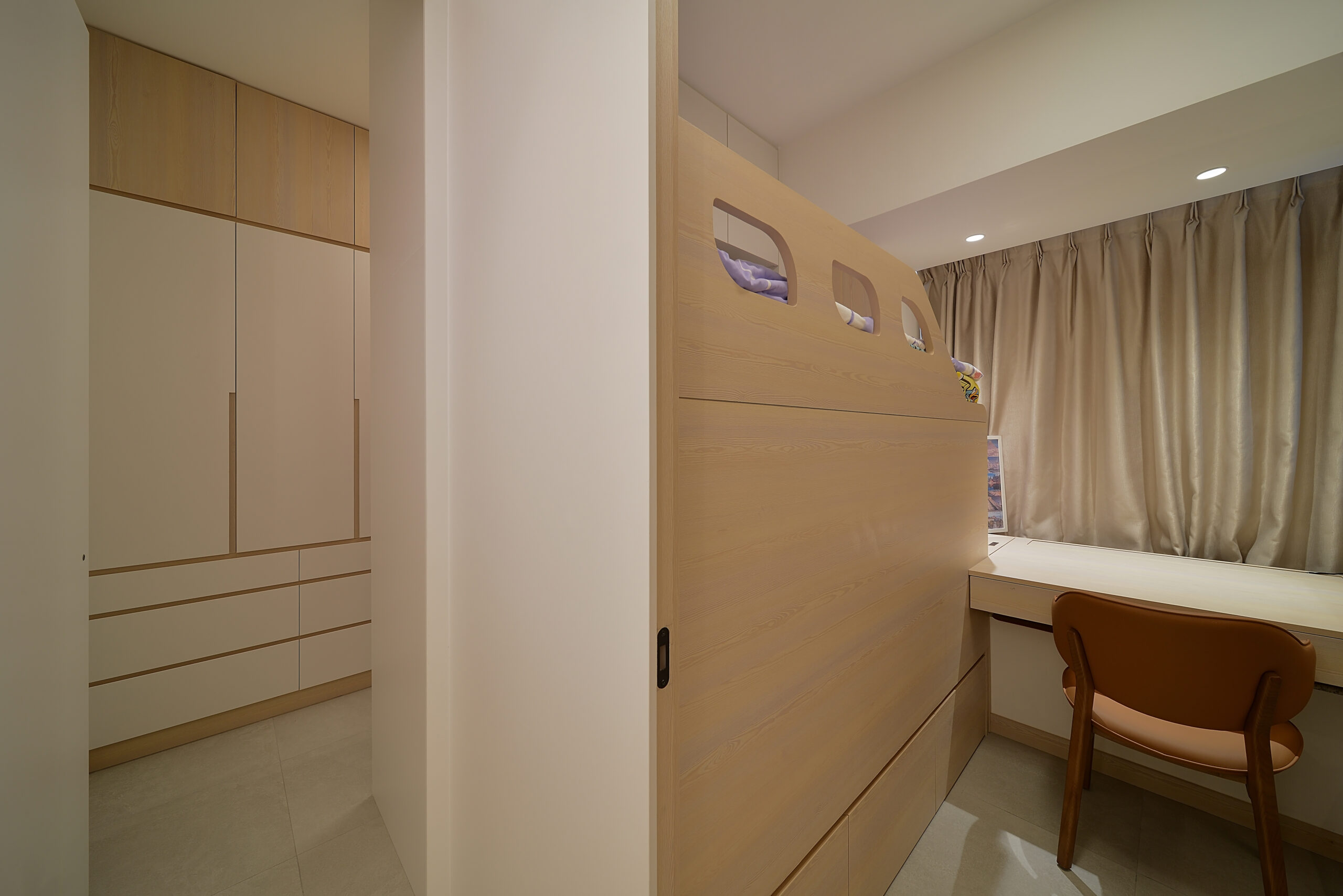 兒女房以實用為核心,設計師精心規劃每一寸空間,打造舒適且功能齊全的成長環境。特別打造 Z形上下格床作為兒女房間的分隔。節省了空間之餘,同時增強了互動性。