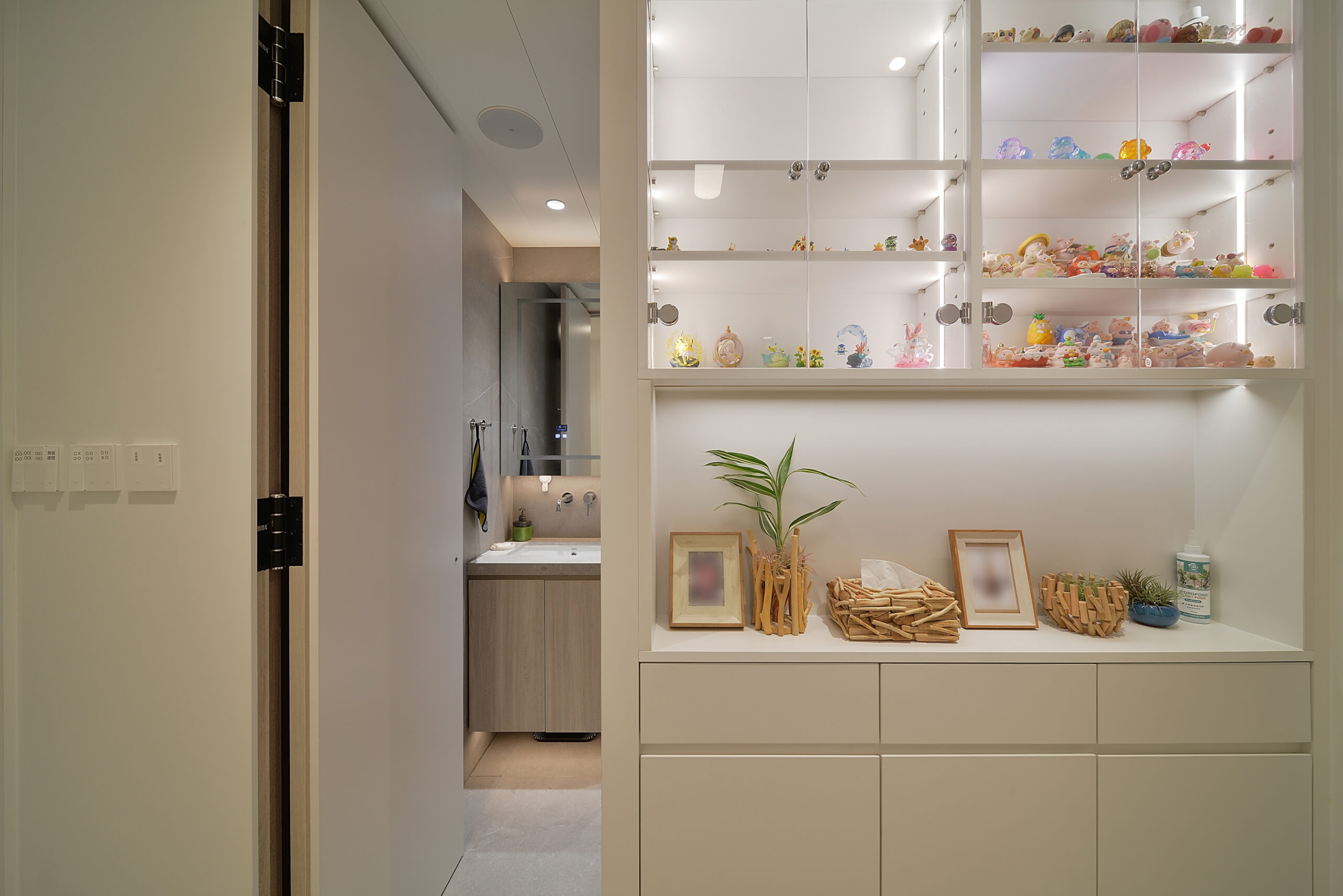 兒女房外走廊與客廁構成獨立空間,設計師將客廁的非主力牆身拆除,改以雙面櫃作為間隔。