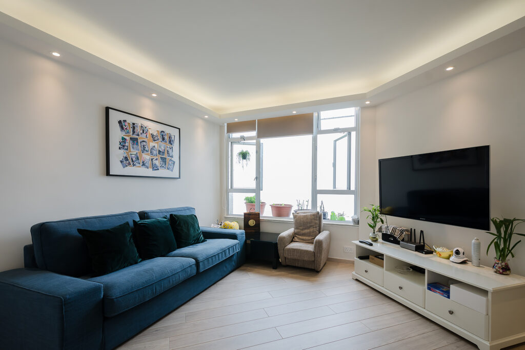 深藍色的布藝梳化成為空間的亮點,為整體設計增添了一份型格與時尚感。
