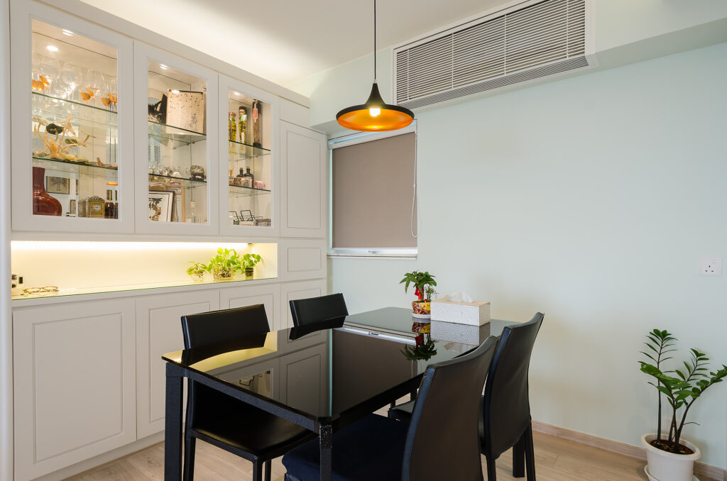 飯廳櫃以純淨的白色為主調,搭配時尚的黑色燈飾,在簡約中流露出一絲摩登氣息。