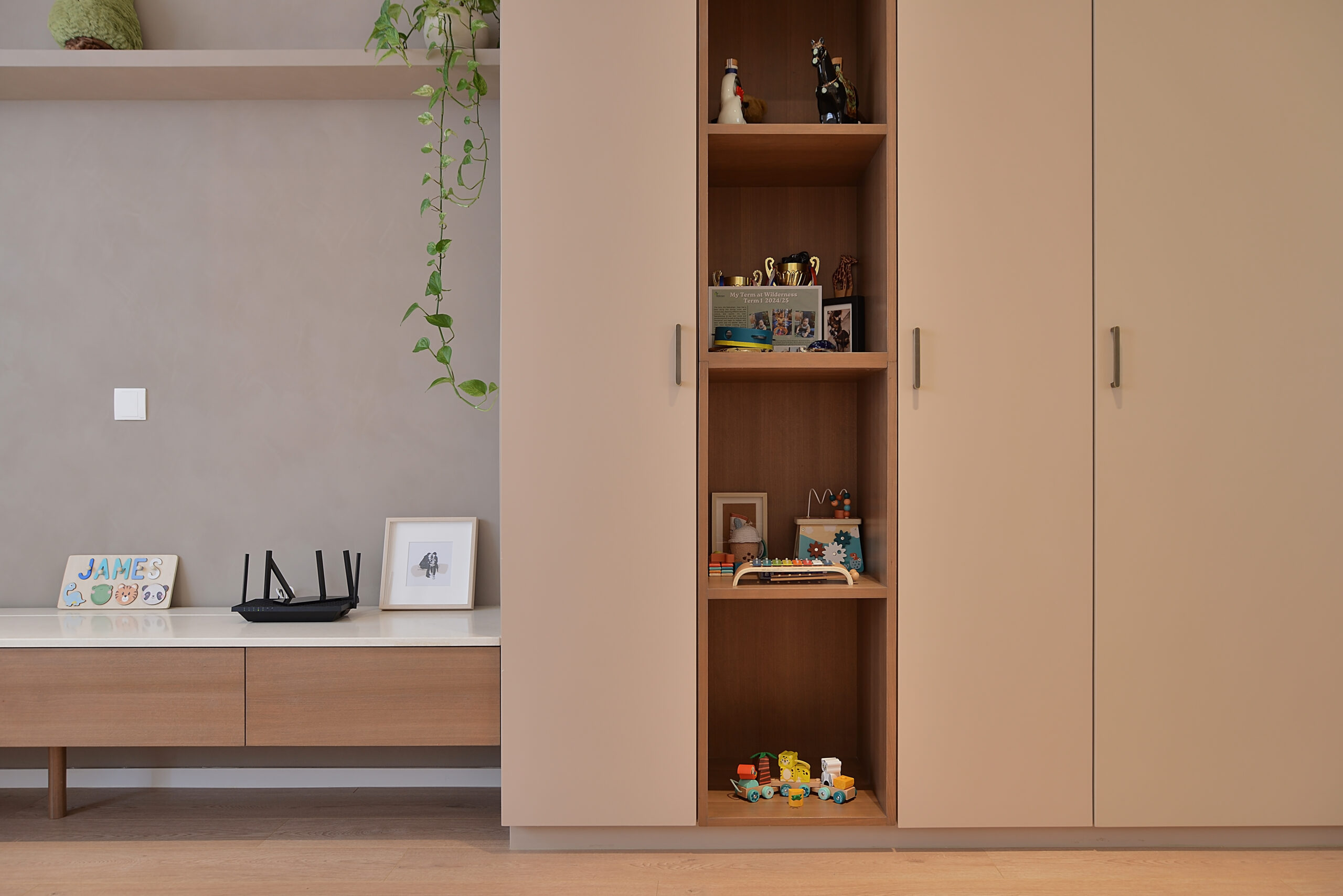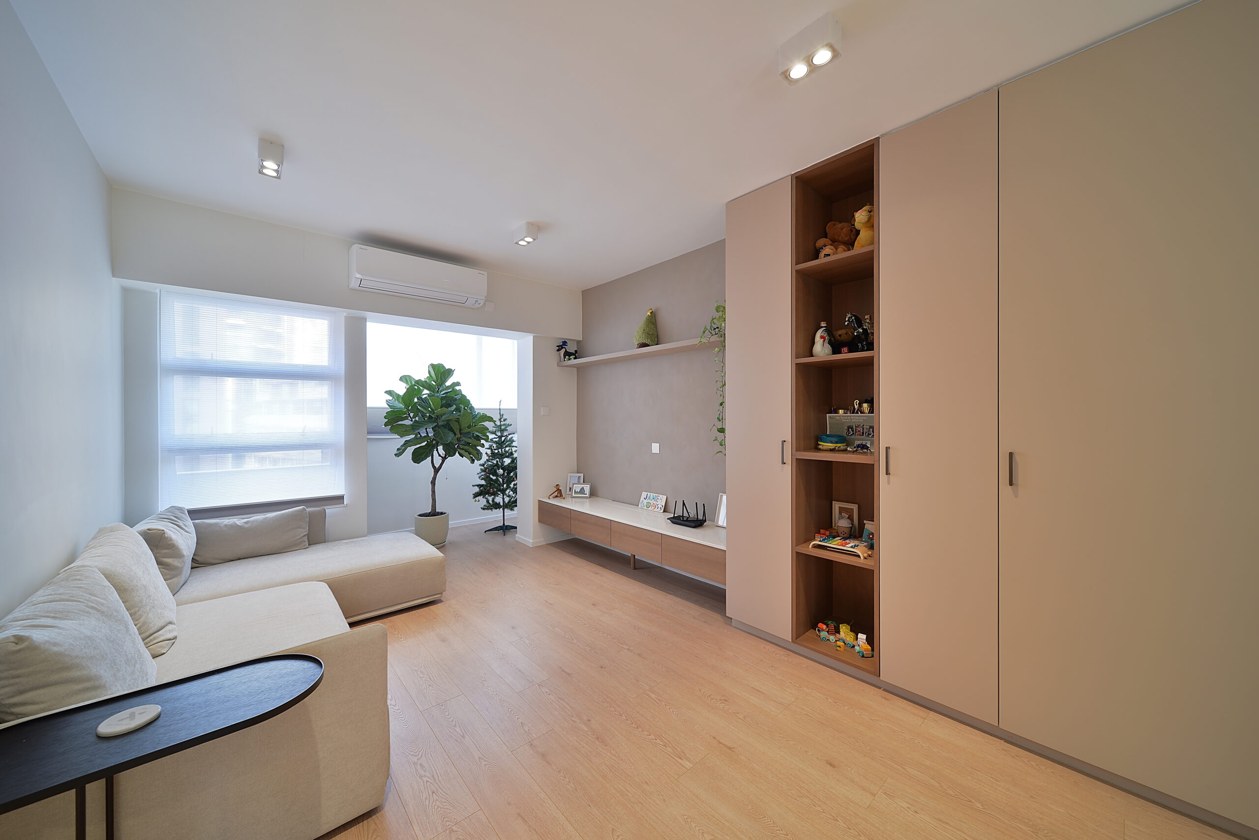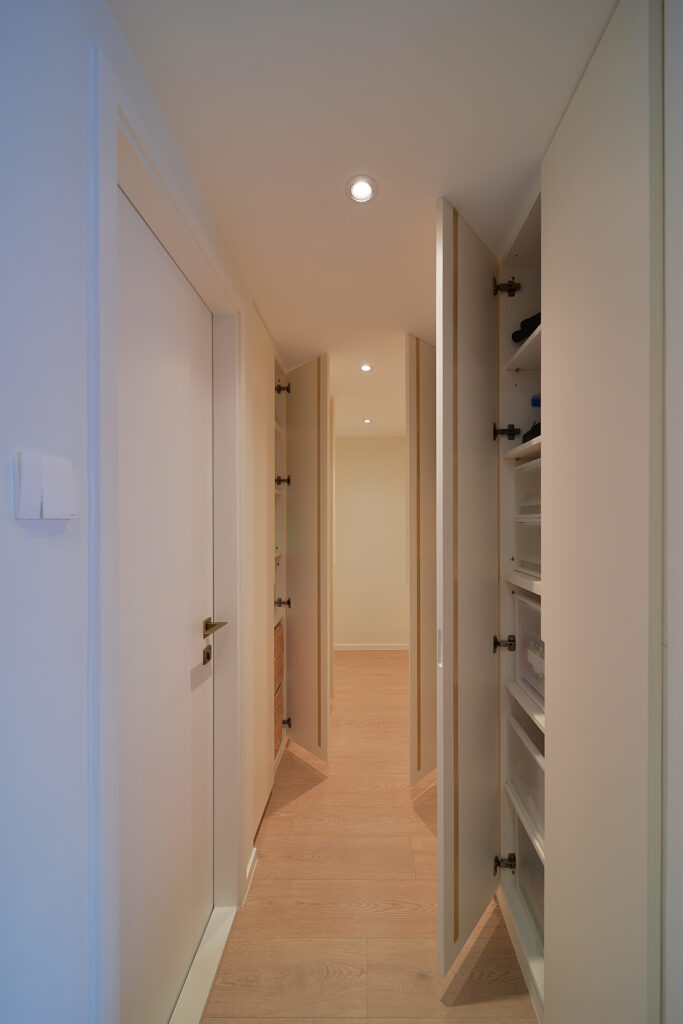 走廊經過重新規劃,不僅提供更寬闊的活動空間,更在兩房門頂至走廊處,巧妙設置四乘六呎的儲物閣,充分利用垂直空間。這種空間重組為嬰兒創造了更大的活動範圍,也為全家人帶來更舒適的居住體驗。